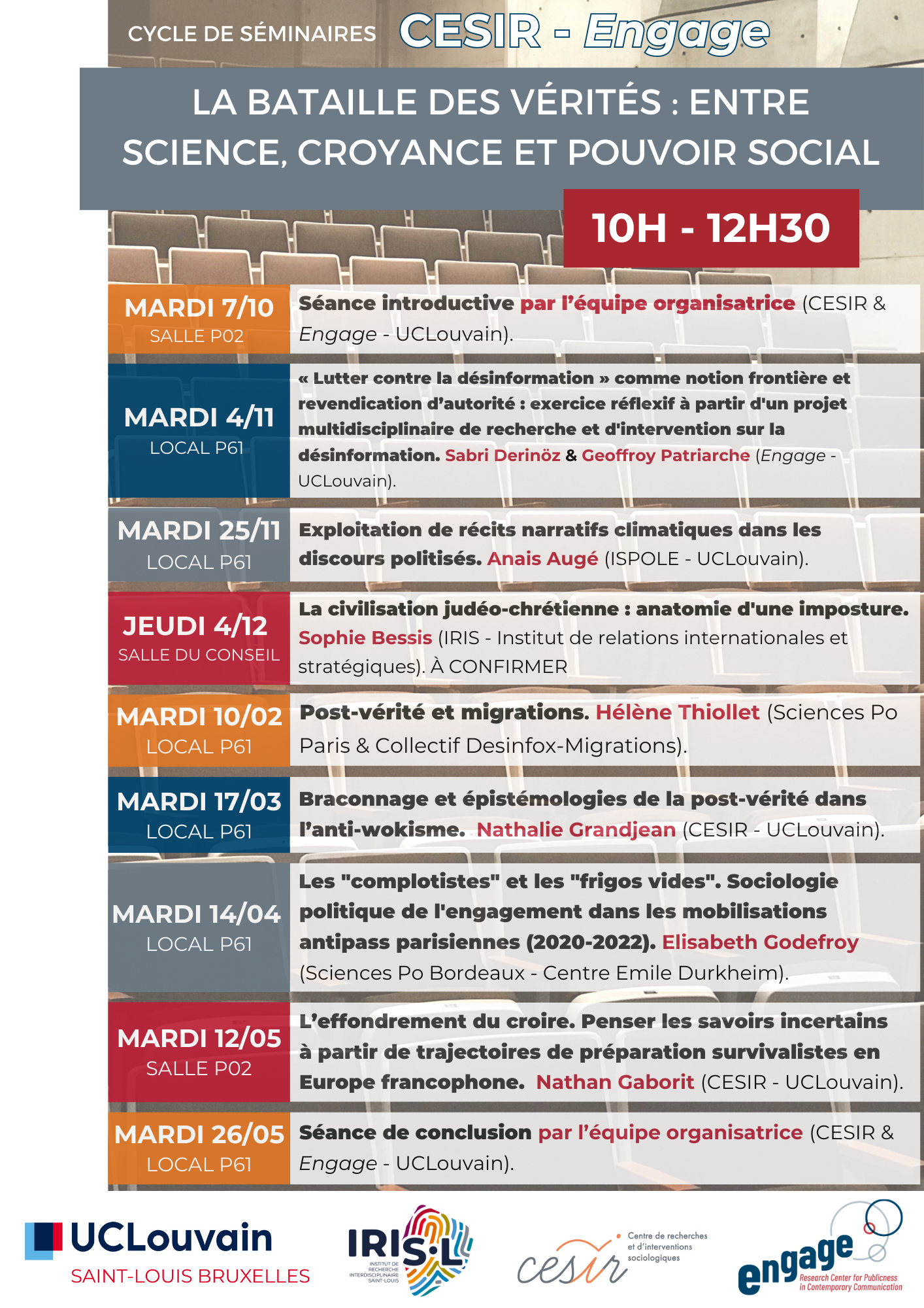Dans la lignée de la dynamique interdisciplinaire qui caractérise l’IRIS-L, les centres de recherche en sociologie CESIR et en science de la communication Engage de l'UCLouvain Saint-Louis Bruxelles coorganisent cette année 2025-2026 un cycle de séminaires conjoints autour de la thématique : « La bataille des vérités : entre science, croyance, et pouvoir social ». (cf. programme ci-joint).